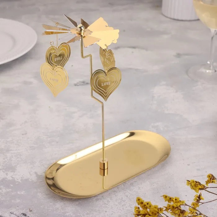 Вращающийся подсвечник от свечи, вдохновленный волшебными мелочами из сказок, мягко крутится вокруг своей оси, словно маленький мир, освещенный нежным сиянием свечи. Основание подсвечника выполнено из искусно выкованного металла, украшенного изящными фигурками. В центре подсвечника установлена тонкая металлическая ось, на которую аккуратно насажен сам подсвечник.