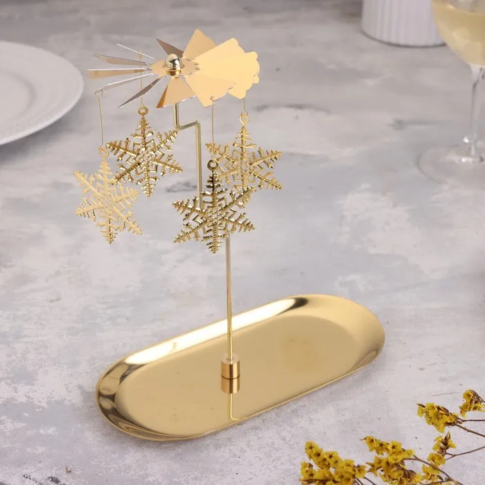Вращающийся подсвечник от свечи, вдохновленный волшебными мелочами из сказок, мягко крутится вокруг своей оси, словно маленький мир, освещенный нежным сиянием свечи. Основание подсвечника выполнено из искусно выкованного металла, украшенного изящными фигурками. В центре подсвечника установлена тонкая металлическая ось, на которую аккуратно насажен сам подсвечник.