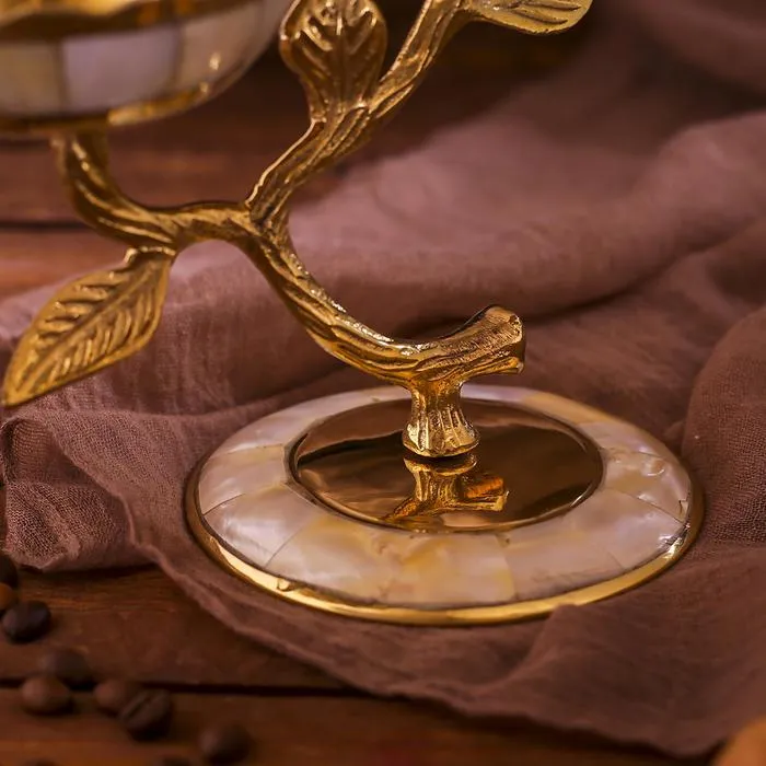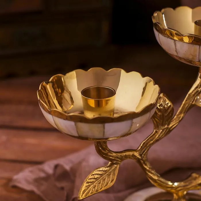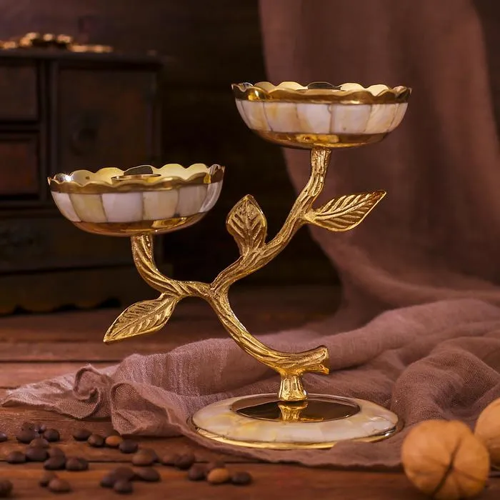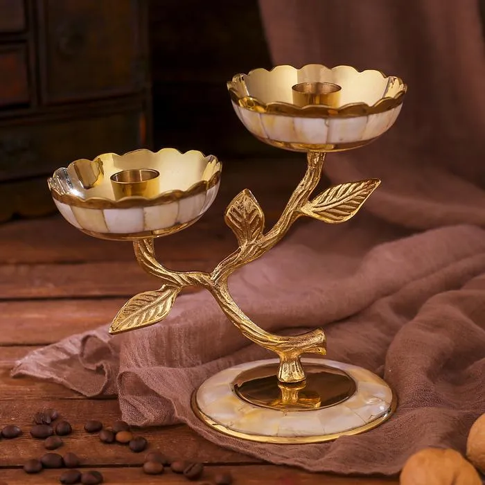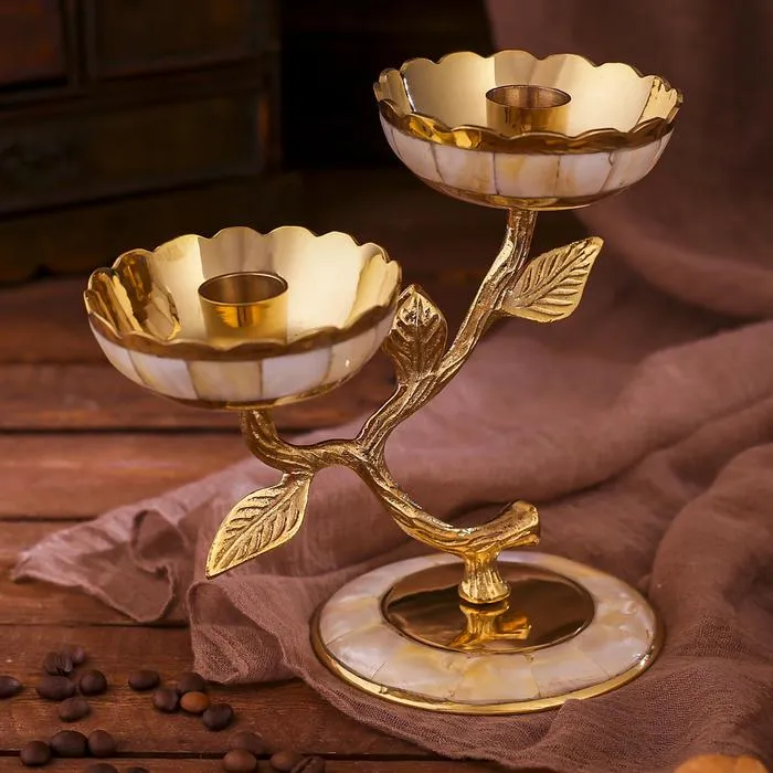 Подсвечник латунь на 2 свечи "Цветение" с перламутром 16х10х16,5 см словно настоящий королевский аксессуар, который недавно стоял в огромном коридоре большого царского замка. Его блеск переливается в лучах света, хочется прикоснуться к нему или даже взять в руки, чтобы ощутить тяжесть латуни и нежные изгибы подсвечника. Такой грациозный предмет станет актуальным подарком на семилетнюю годовщину свадьбы, юбилей, 8 Марта и любой другой праздник. Подсвечник, который подчеркнет Ваш безупречный вкус!
