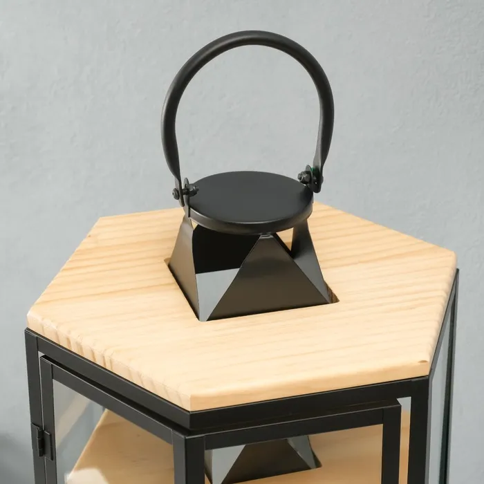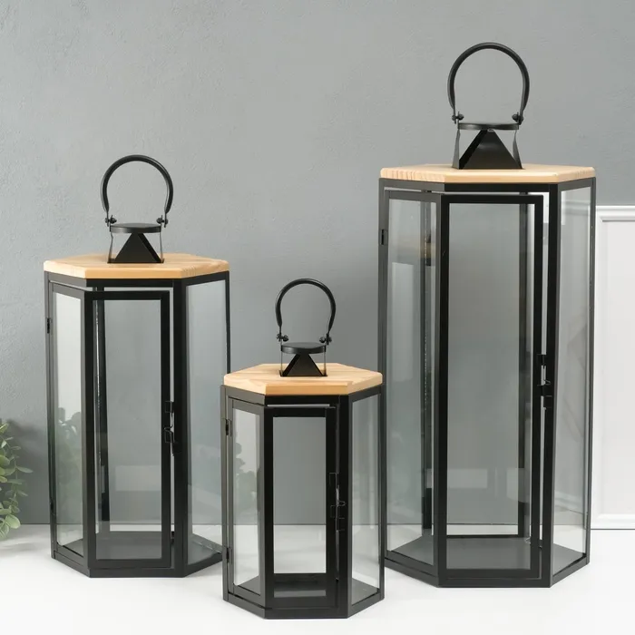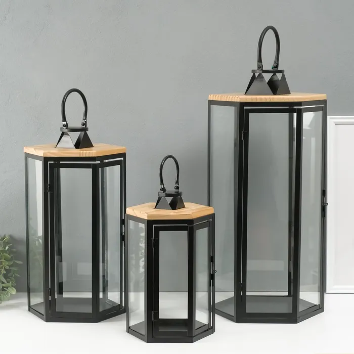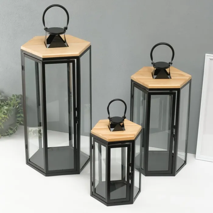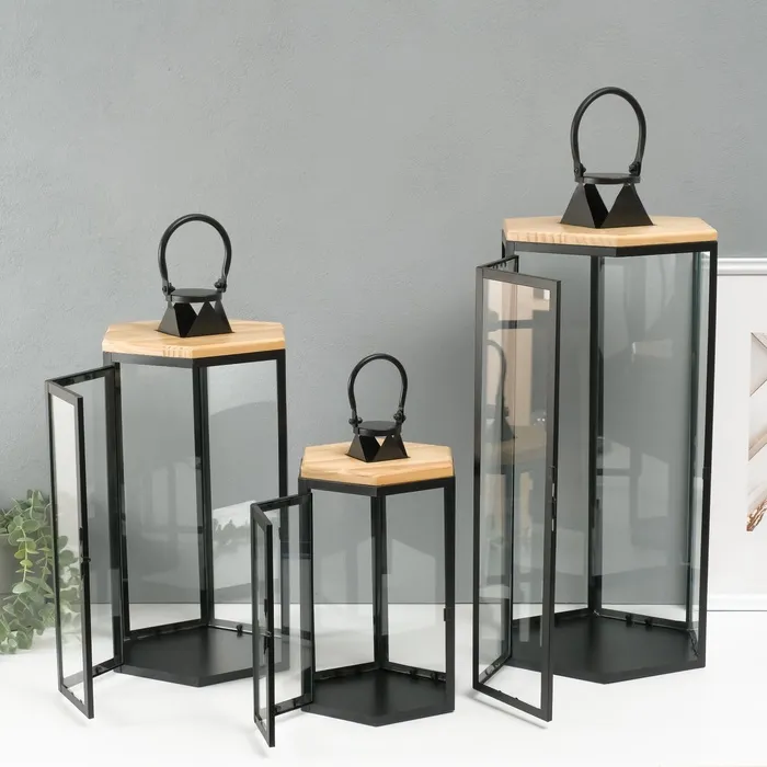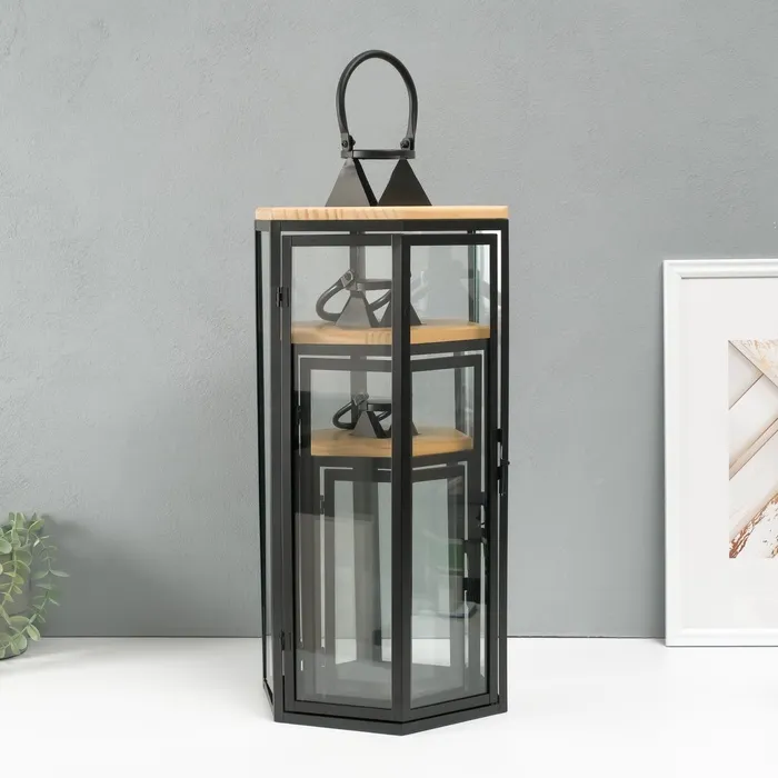Подсвечник металл, дерево, фонарь"Шесть граней" набор 3 шт 22,5х19,5х43,5; 18,5х16х31 см — Характеристики
