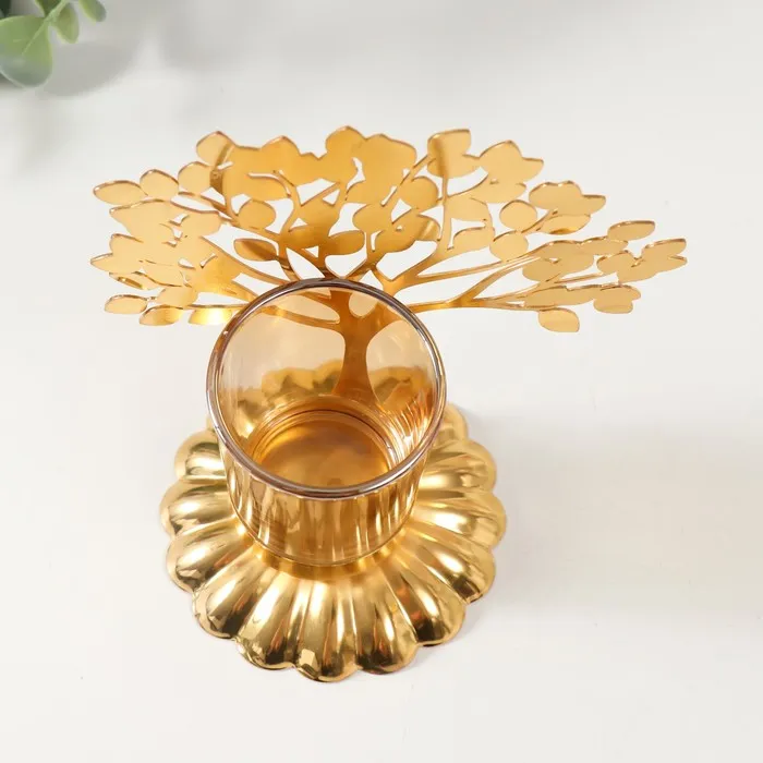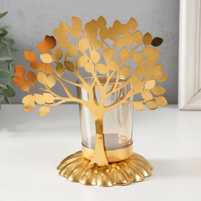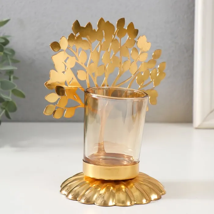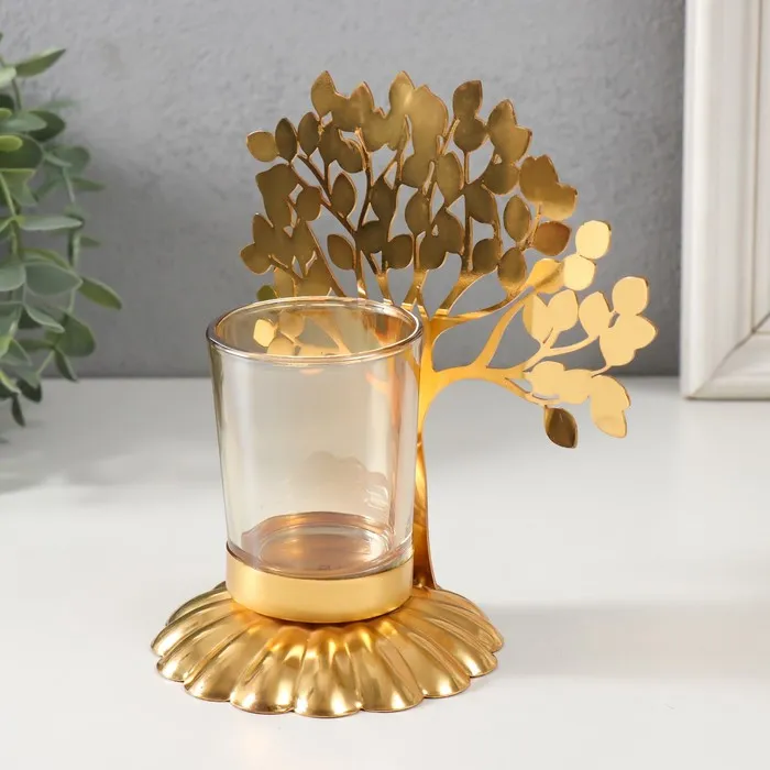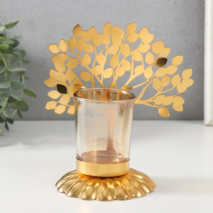 Подсвечник металл, стекло на 1 свечу «Дерево с листьями», d=4.7 см, золото, 14.7×9.3×15 см — Характеристики