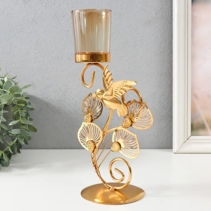 Подсвечник металл, стекло на 1 свечу «Полет колибри», d=4.7 см, золото, 15.5×9×27.8 см — Характеристики