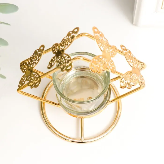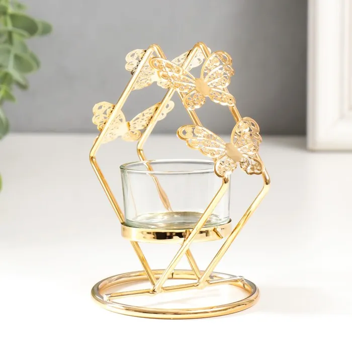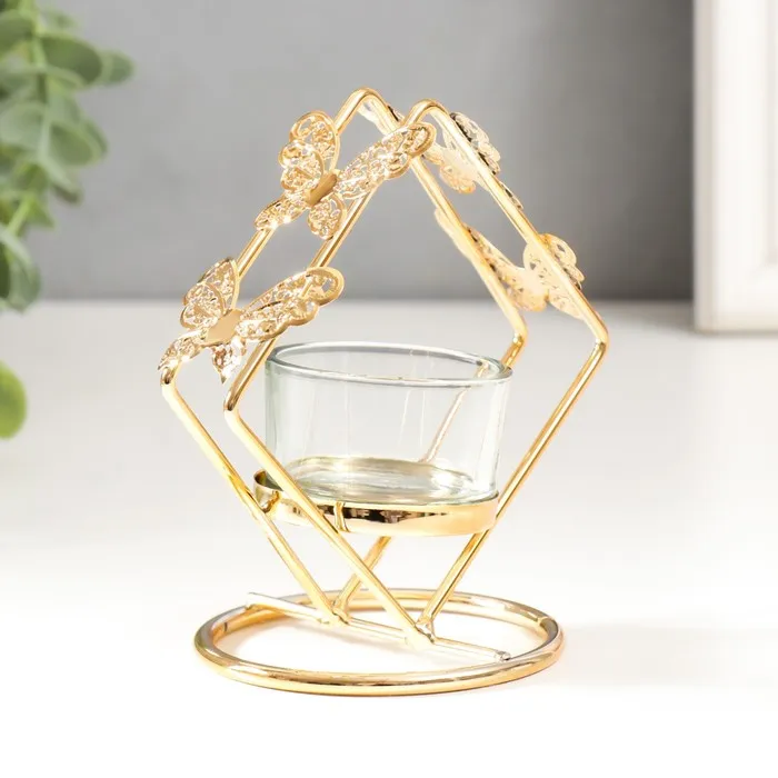 Подсвечник металл, стекло на 1 свечу "Ромб с бабочками" d-4 см золото 7,5х11х11,5 см — Характеристики