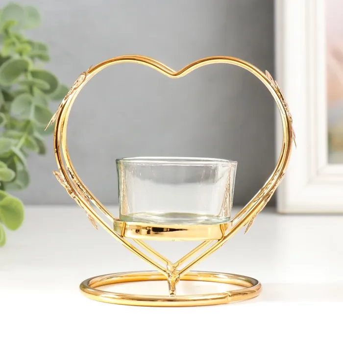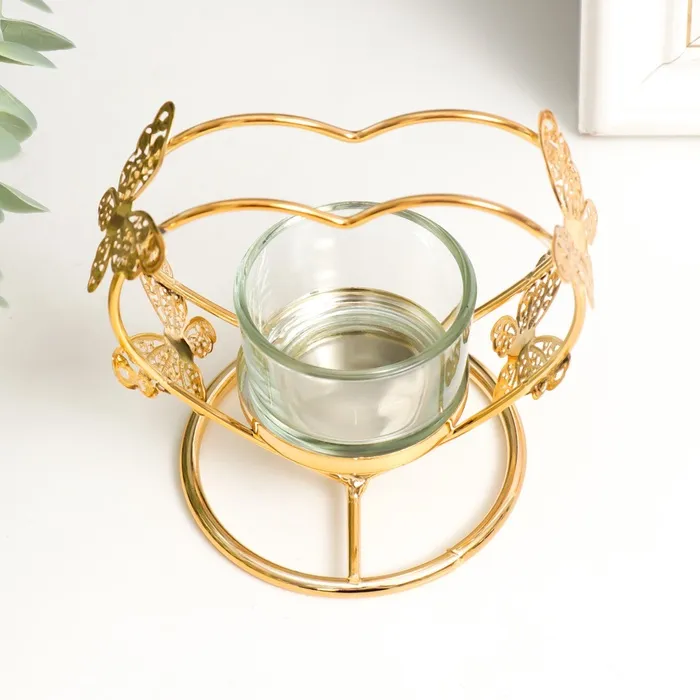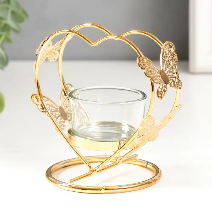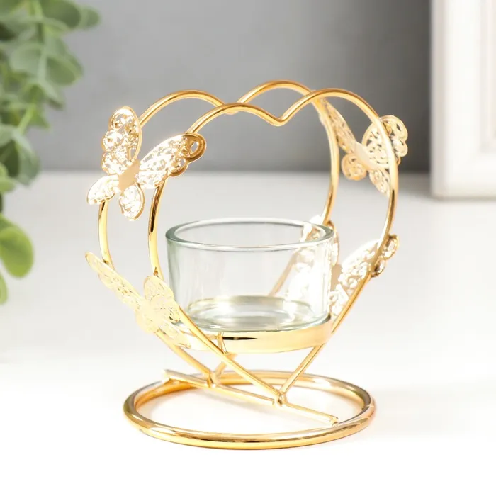 Подсвечник металл, стекло на 1 свечу "Сердце с бабочками" d-4 см золото 7,5х10х10 см — Характеристики