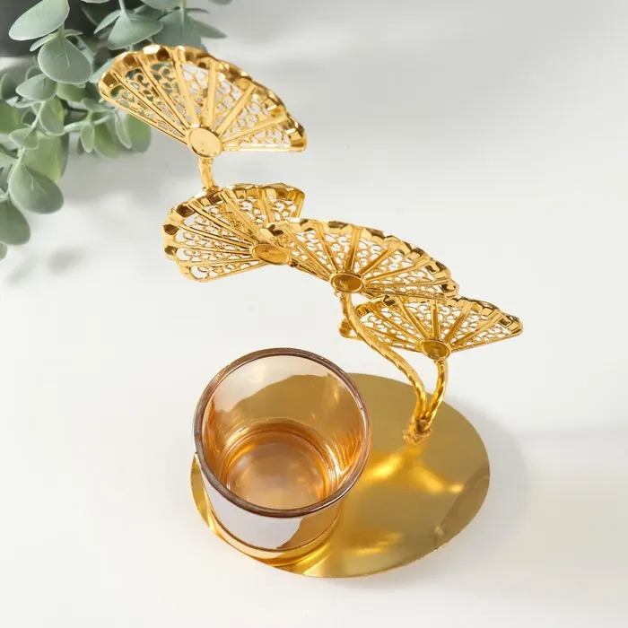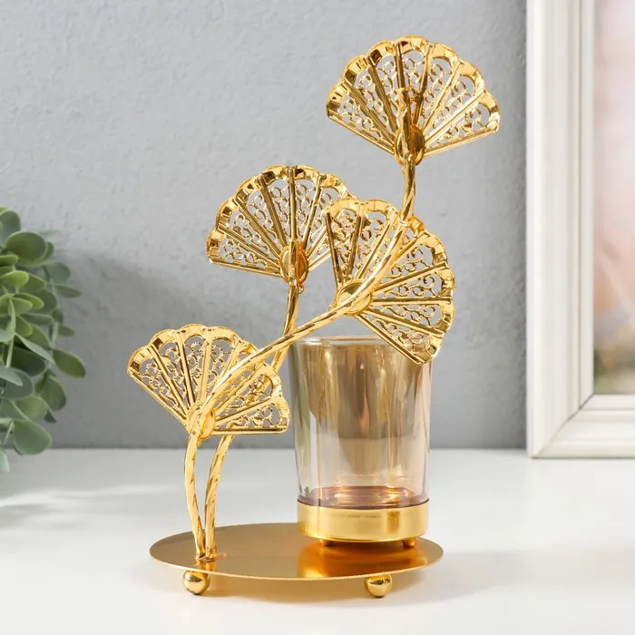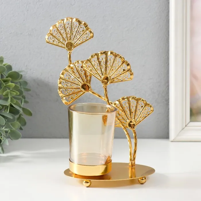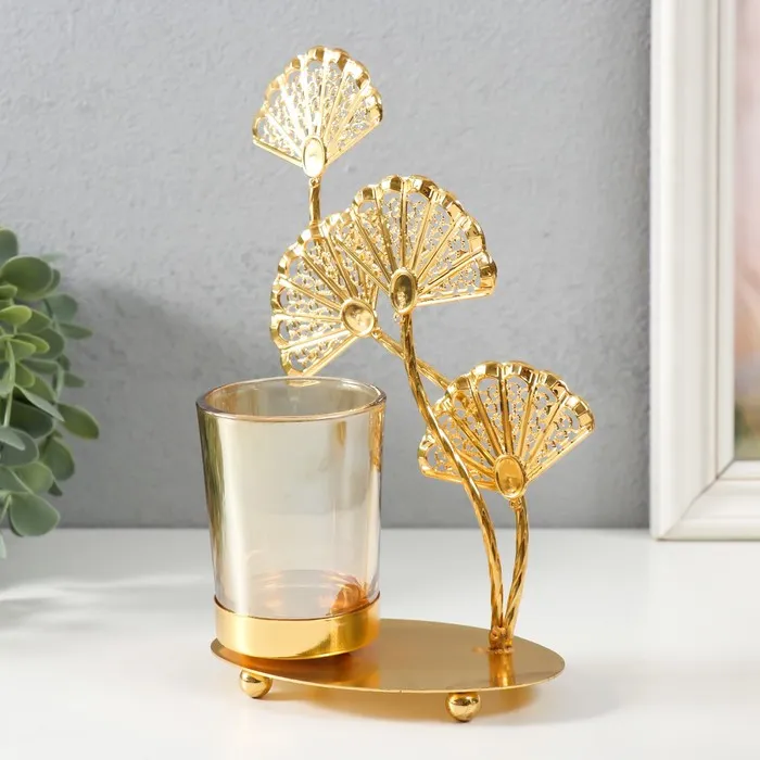 Подсвечник металл, стекло на 1 свечу «Цветы-веера», d=4.7 см, золото, 16.7×8×21.5 см — Характеристики