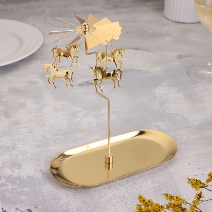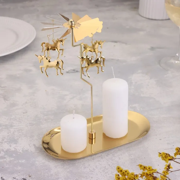 Вращающийся подсвечник от свечи, вдохновленный волшебными мелочами из сказок, мягко крутится вокруг своей оси, словно маленький мир, освещенный нежным сиянием свечи. Основание подсвечника выполнено из искусно выкованного металла, украшенного изящными фигурками. В центре подсвечника установлена тонкая металлическая ось, на которую аккуратно насажен сам подсвечник.