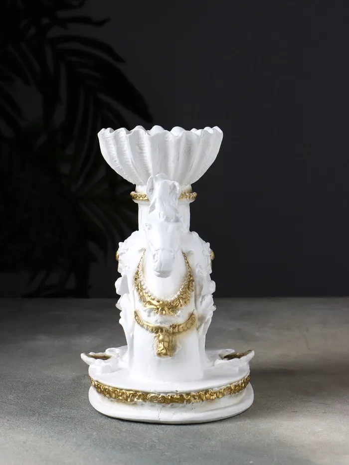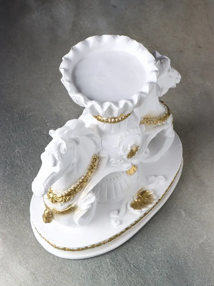 Элегантный гипсовый подсвечник с изящным силуэтом лошади привнесёт в интерьер ноту благородной простоты. Белоснежная поверхность с золотистыми акцентами создаёт игру света, когда свеча оживляет композицию мягким мерцанием. Форма высотой 21 см сохраняет баланс между выразительностью и лаконичностью.