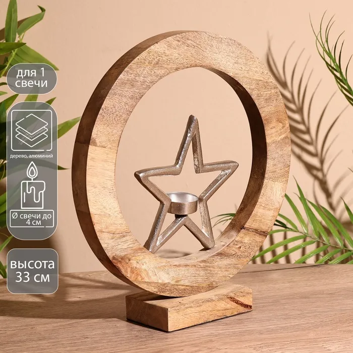 Подсвечник в деревянном кольце "Звезда" 30х8х33 см