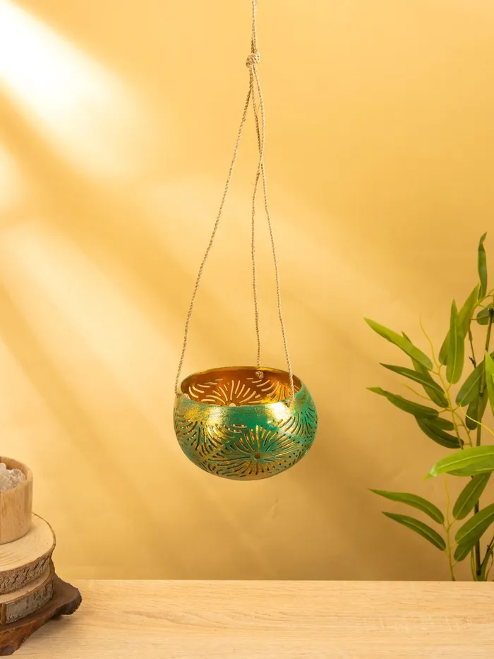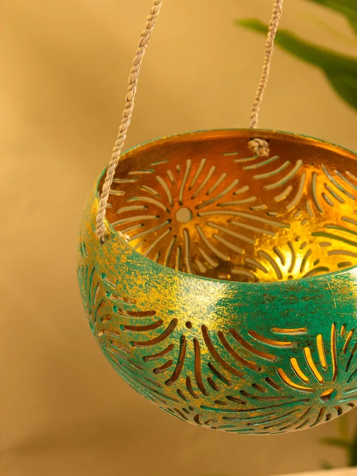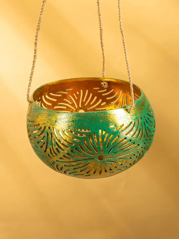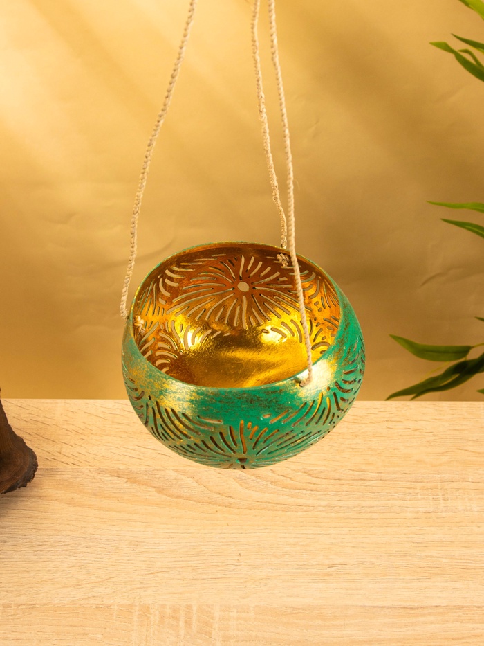 Подсвечник подвесной из кокоса, 12-14 см, тёмно зелёный-золотой — Характеристики