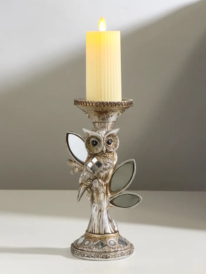 Подсвечник на 1 свечу «Филин на дереве с зеркальными листьями», полистоун, 11.5×9×24.2 см