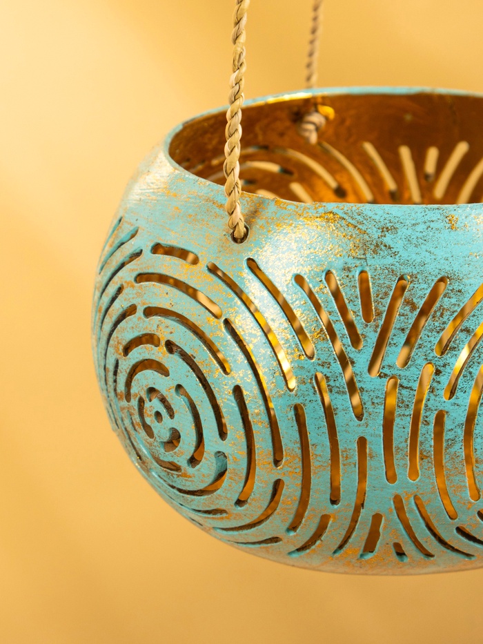 Подсвечник подвесной из кокоса, 14×14×10 см, бирюзово-золотой — Характеристики