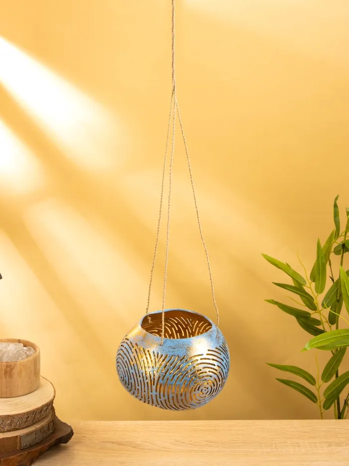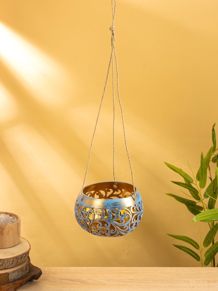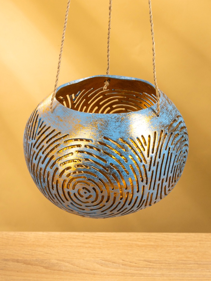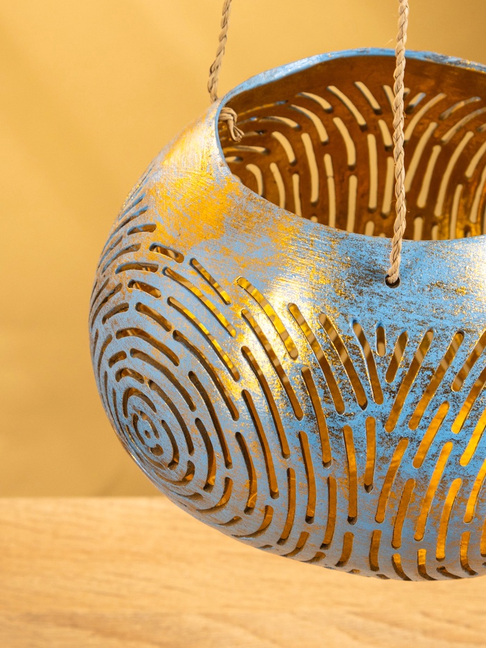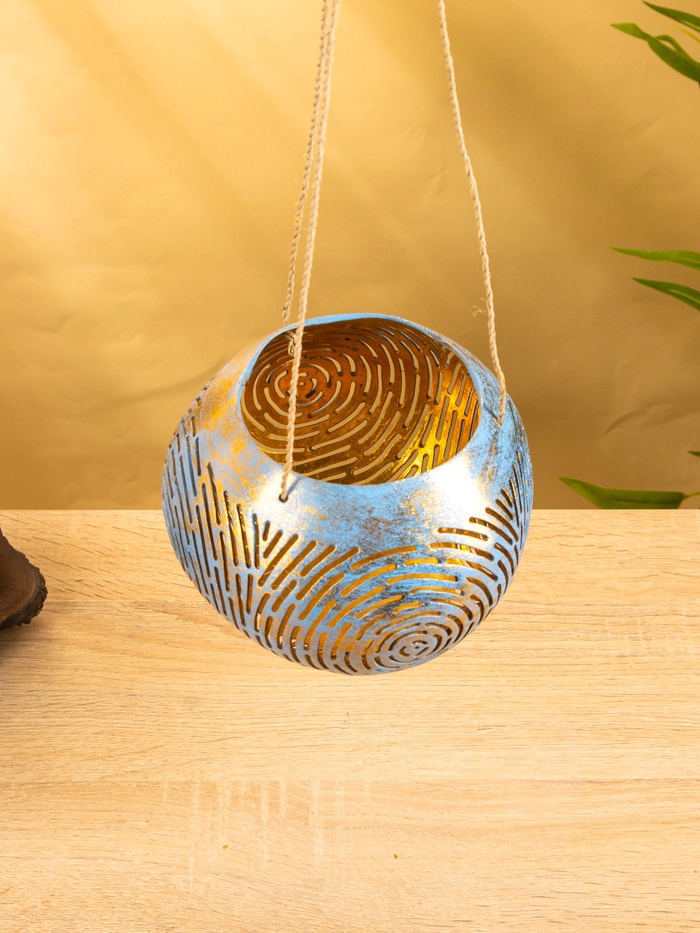 Подсвечник подвесной из кокоса, 14×14×10 см, голубой-золотой