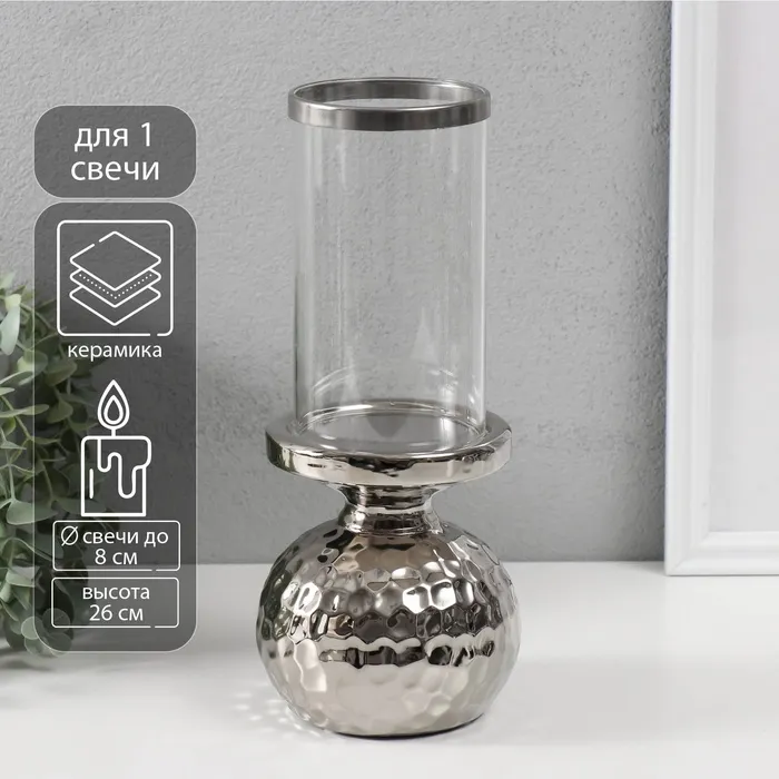 Подсвечник на 1 свечу «Лоджуар», керамика, стекло, d=8 см, серебро, 10.5×10.5×26 см