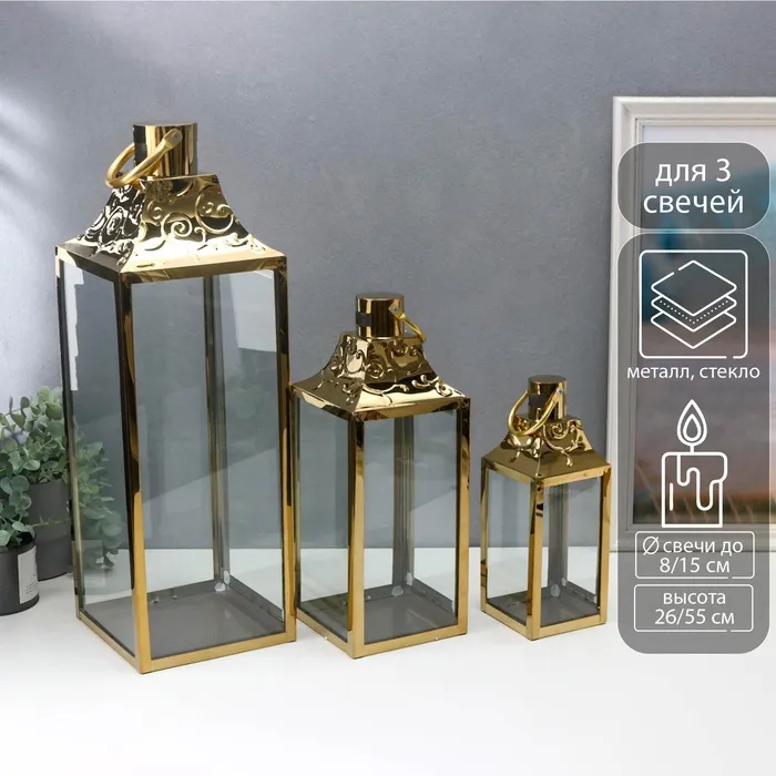 Подсвечник металл, стекло фонарь"Завитки"золото н-р 3 шт 55х18х18 37,5х14,5х14,5 26х10х10 см 54492