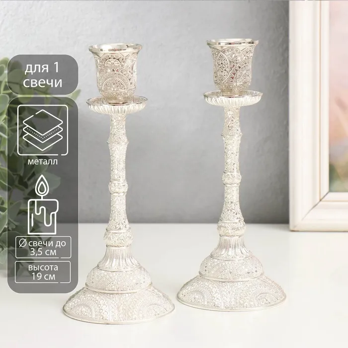 Металлический подсвечник на 1 свечу «Великолепный век», набор 2 шт., серебро, 19×8×8 см