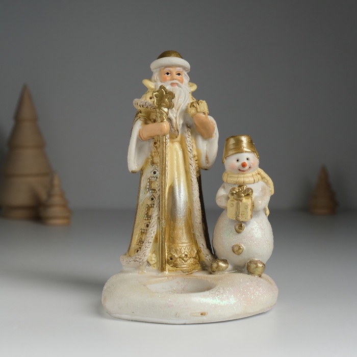 Подсвечник на 1 свечу полистоун «Фигурка: Дед Мороз в коричневой шубе со снеговиком», d=3.5 см, 10.3×9.8×14 см