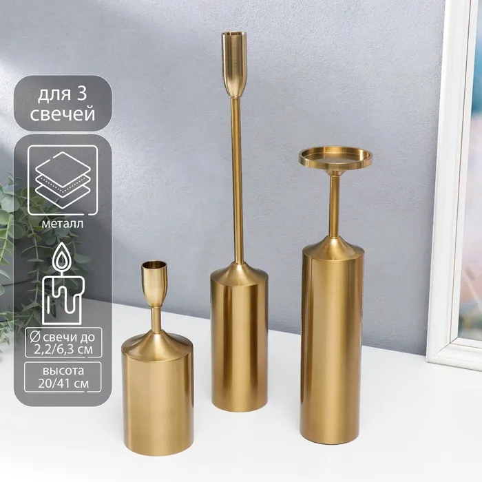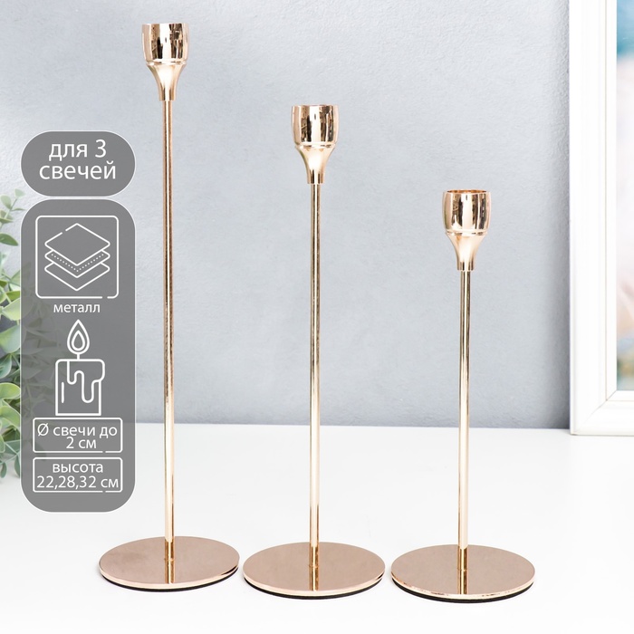 Набор подсвечников на 1 свечу «Классика», 3 шт., под медь, h=22; 28; 32 см; 32×8×8 см