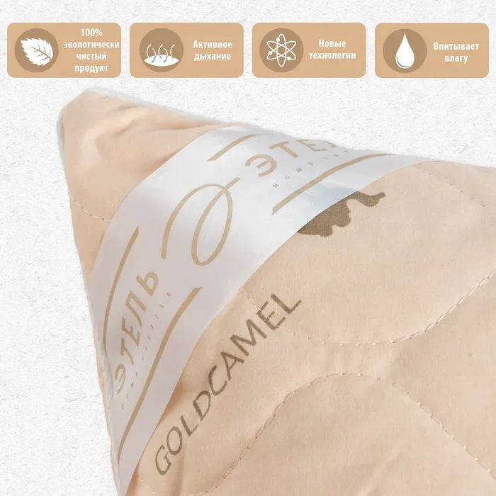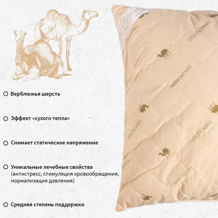 Подушка состоит из наполнителя из верблюжьей шерсти и нежнейшего лебяжьего пуха. Подушка не только обеспечивает правильное положение тела ночью, но и:
