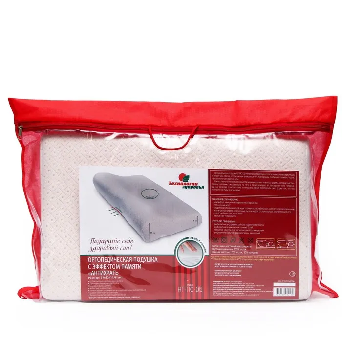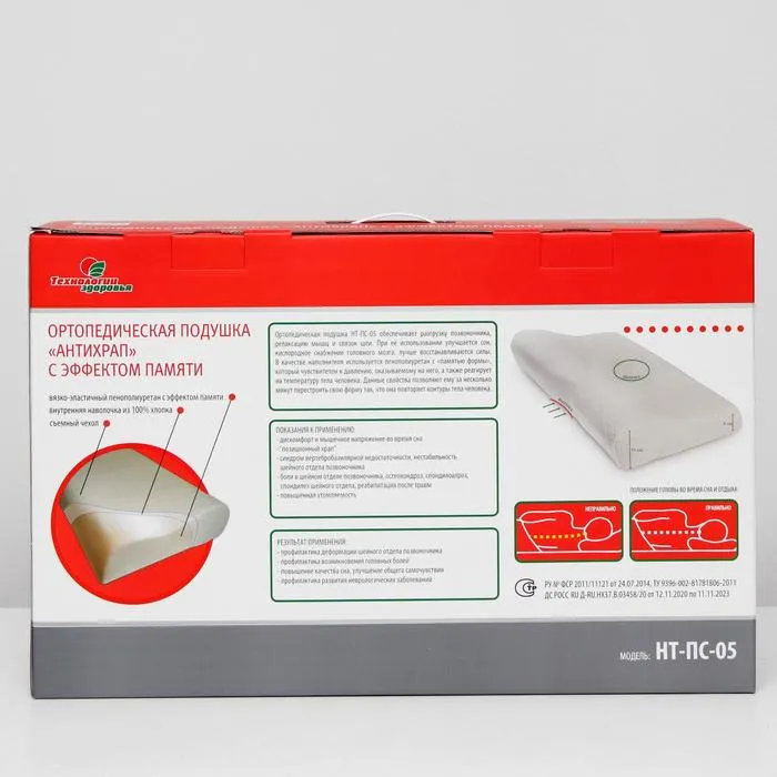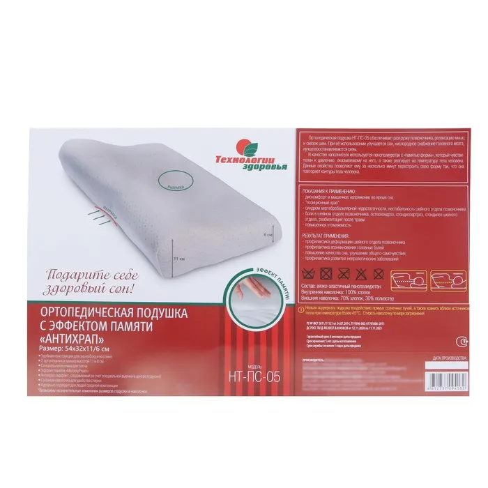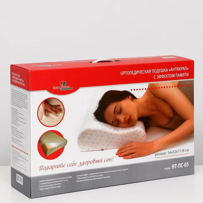 Подушка ортопедическая НТ-ПС-05 "Антихрап", для взрослых, с эффектом памяти и выемкой под плечо, 54x32 см, валики 11/6 см — Характеристики