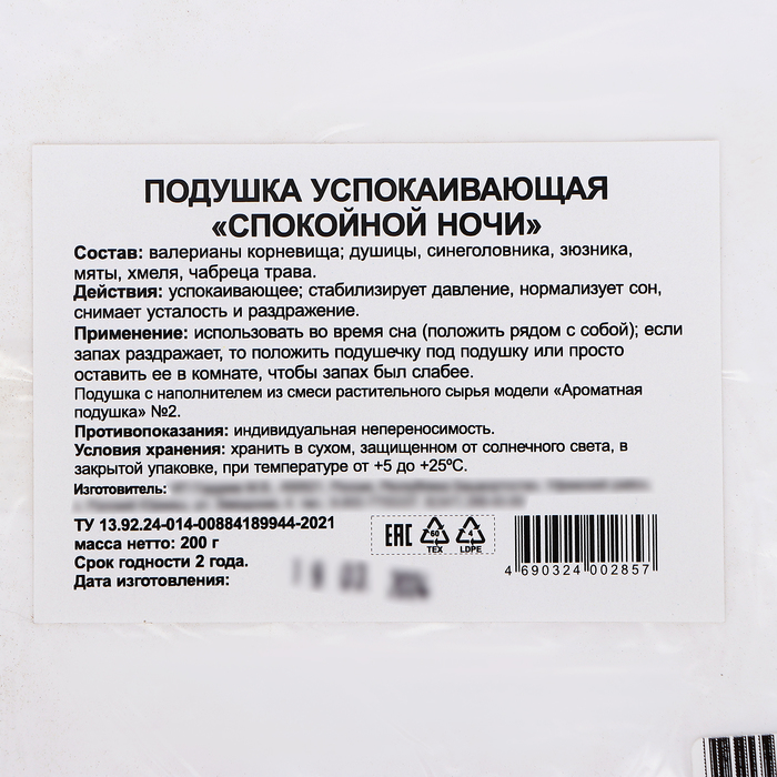 Состав наполнения: сосновая стружка, можжевельник, душица трава, зверобой, мята, полынь, эфирные масла : чабрец, эвкалипт