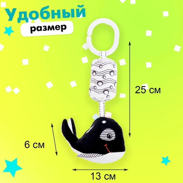 Подвеска помогает развивать слуховое и зрительное восприятие ребёнка. Игрушка легко крепится к любой поверхности, что делает её универсальным решением для дома и прогулок.
