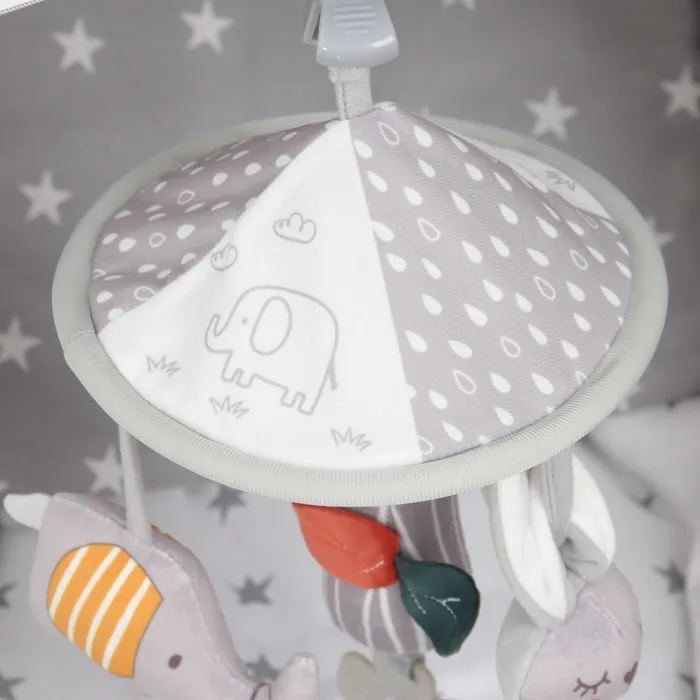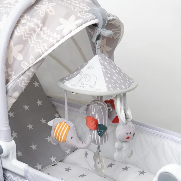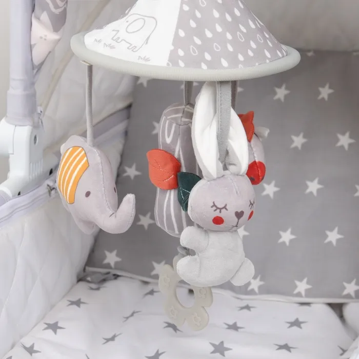 Можно повесить на кроватку, на коляску, на автолюльку.