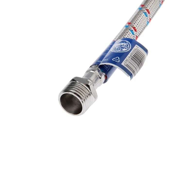 Один конец у подводки оснащен гайкой, а другой — штуцером, что обеспечивает универсальность в установке.
