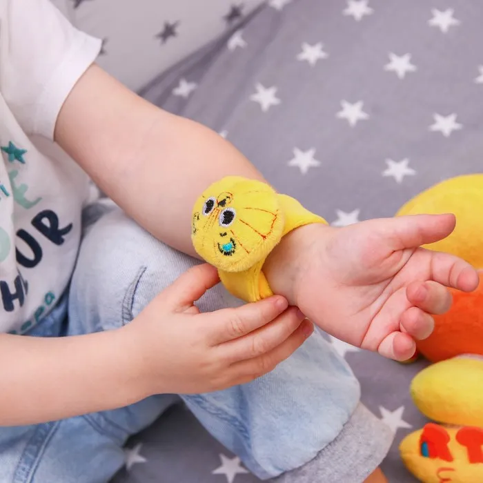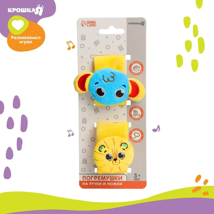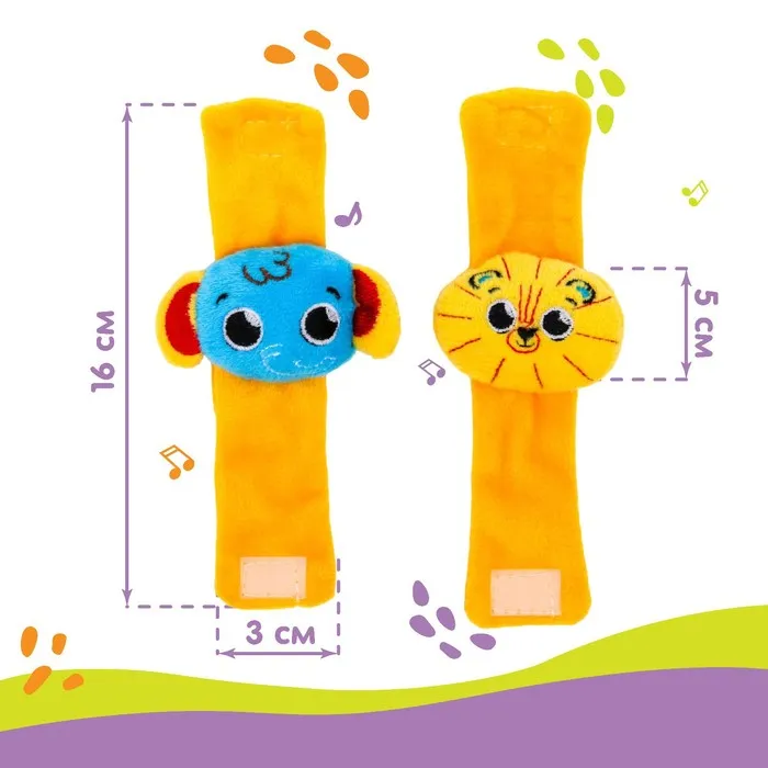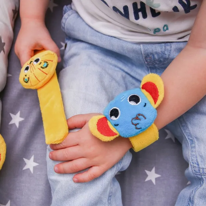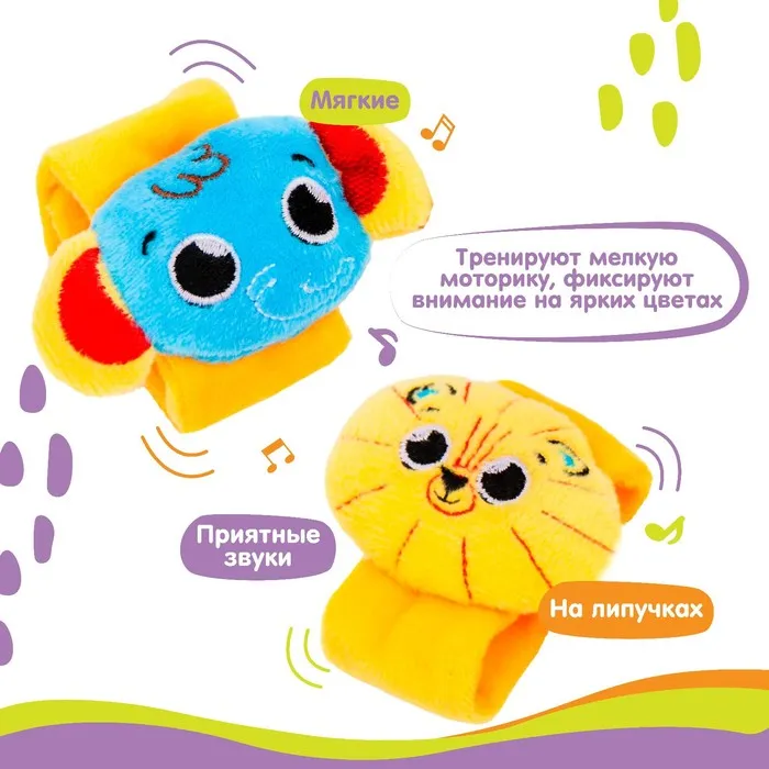Развивающая игрушка выполнена в виде браслетика на липучке. В комплект входят две штуки. Их можно надеть малышу на ручки или ножки. Звуковые элементы будут греметь, когда непоседа сменит положение тела.