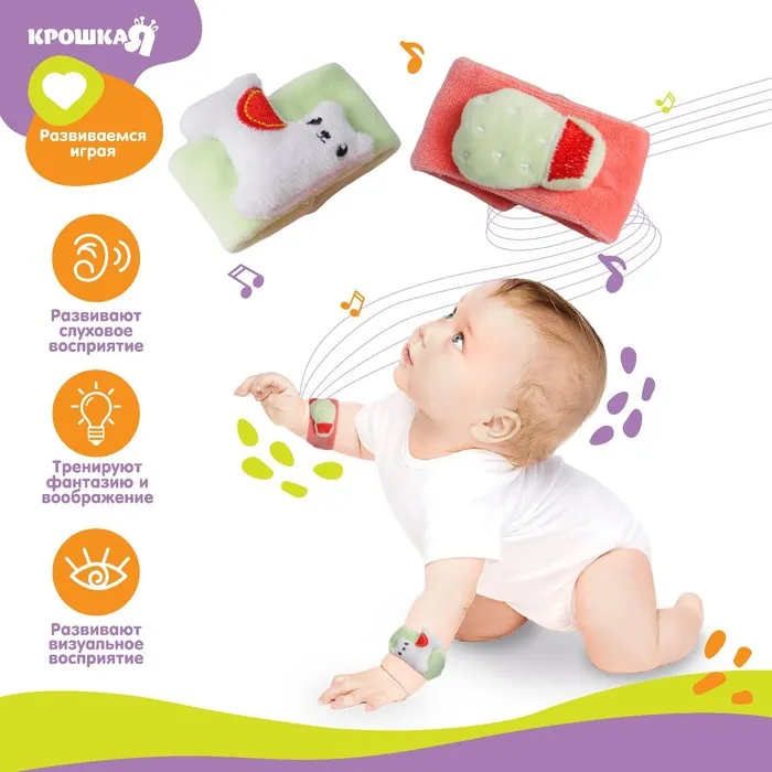 Развивающая игрушка выполнена в виде браслетика на липучке. В комплект входят две штуки. Их можно надеть малышу на ручки или ножки. Звуковые элементы будут греметь, когда непоседа сменит положение тела.