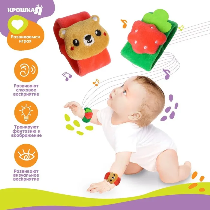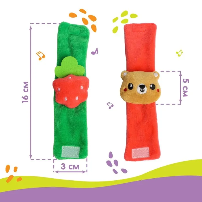 Развивающая игрушка выполнена в виде браслетика на липучке. В комплект входят две штуки. Их можно надеть малышу на ручки или ножки. Звуковые элементы будут греметь, когда непоседа сменит положение тела.