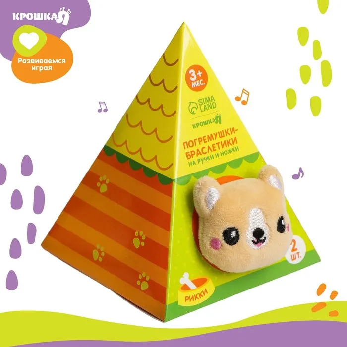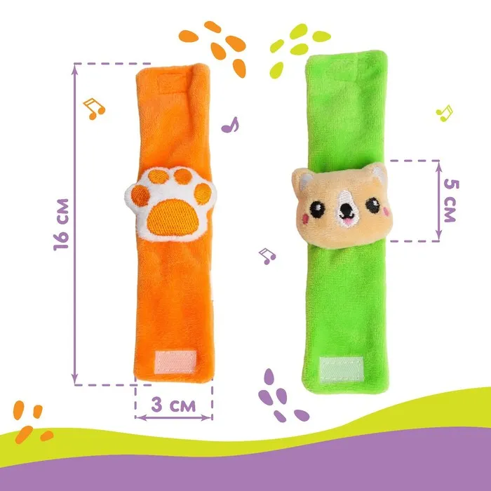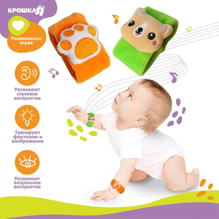 Развивающая игрушка выполнена в виде браслетика на липучке. В комплект входят две штуки. Их можно надеть малышу на ручки или ножки. Звуковые элементы будут греметь, когда непоседа сменит положение тела.