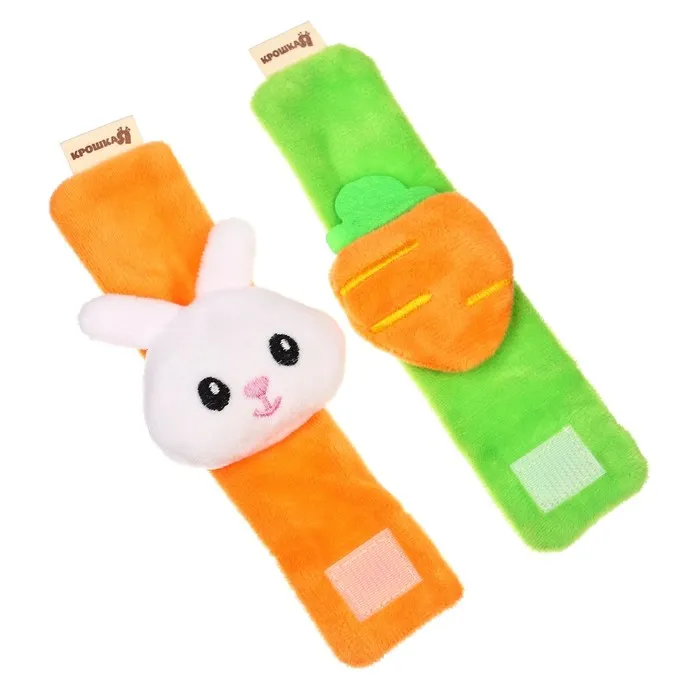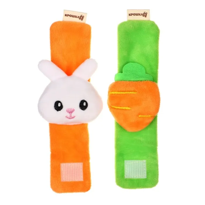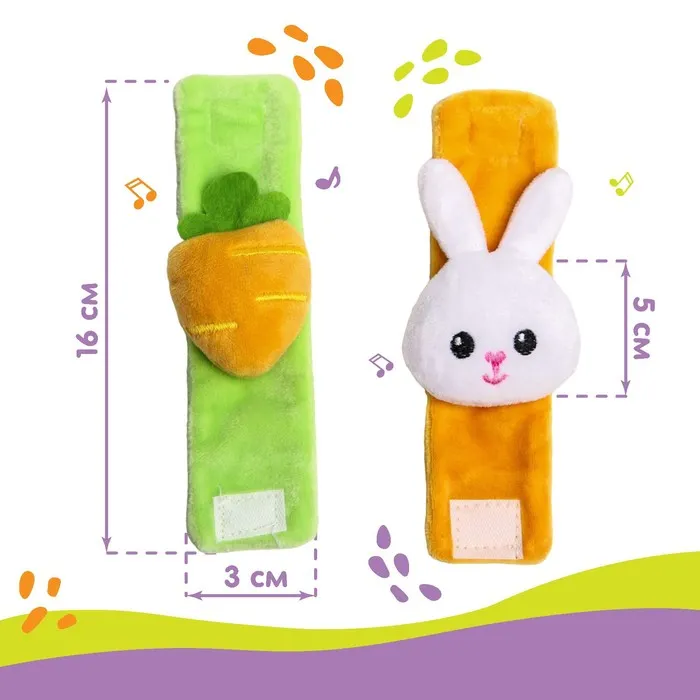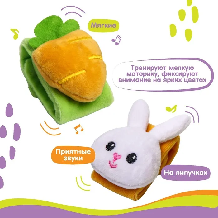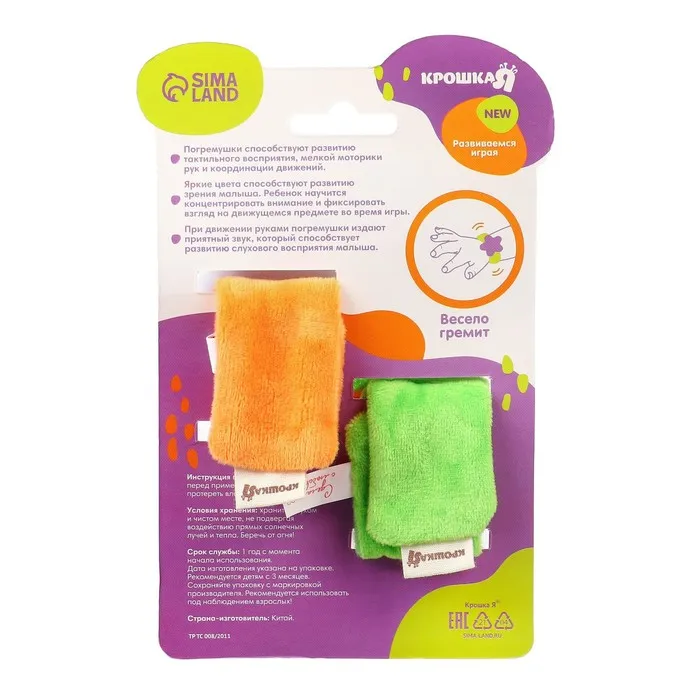 Развивающая игрушка выполнена в виде браслетика на липучке. В комплект входят две штуки. Их можно надеть малышу на ручки или ножки. Звуковые элементы будут греметь, когда непоседа сменит положение тела.