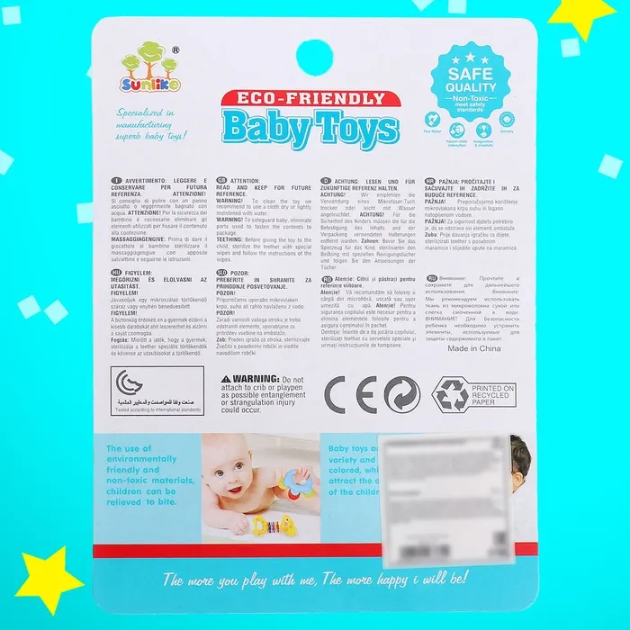 - При взаимодействии с игрушкой ребёнок услышит забавные звуки: внутри погремушки находится элемент с гремящими при движении шариками.