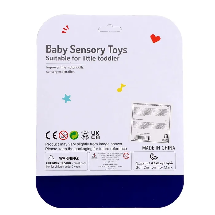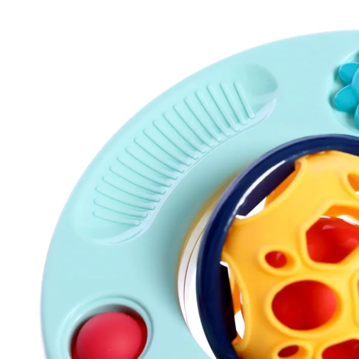 - При взаимодействии с игрушкой ребёнок услышит забавные звуки: внутри погремушки находится элемент с гремящими при движении шариками.