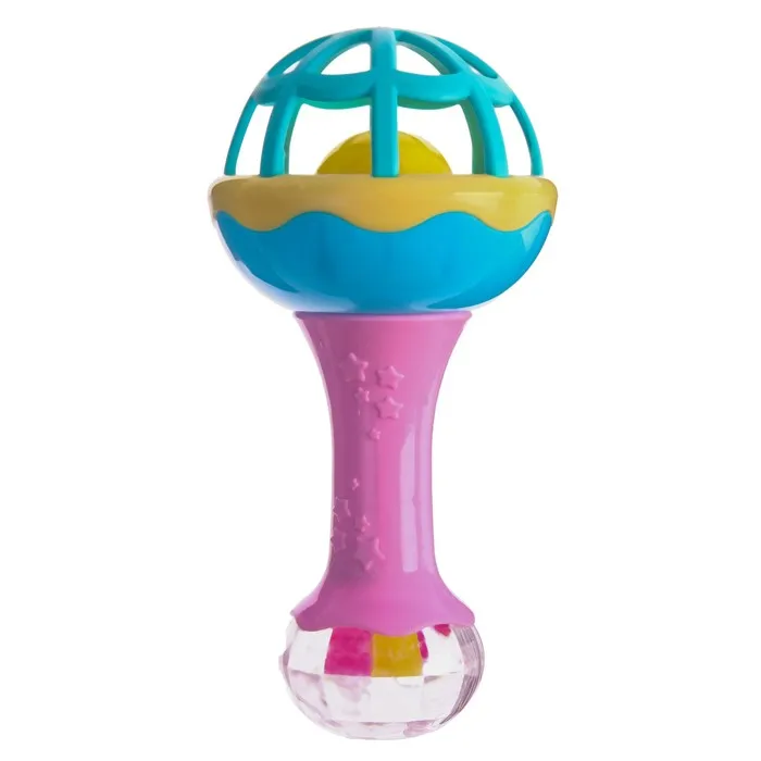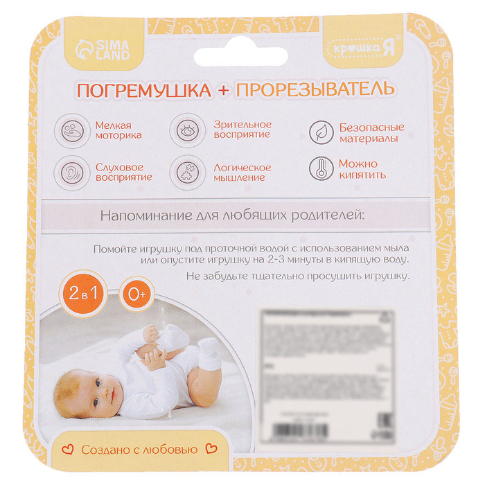 - При взаимодействии с игрушкой ребёнок услышит забавные звуки: внутри изделия находятся гремящие при движении шарики.