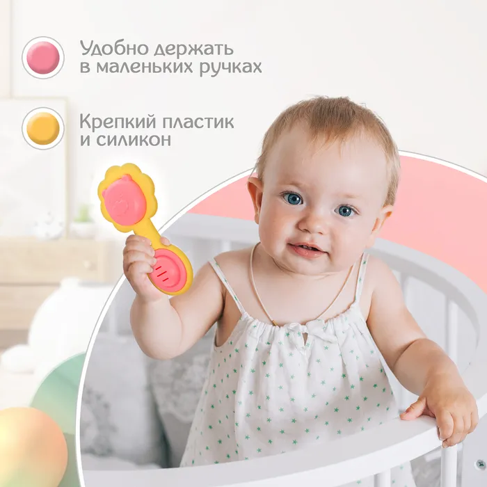 - При взаимодействии с игрушкой ребёнок услышит забавные звуки: внутри погремушки находится элемент с гремящими при движении шариками.
