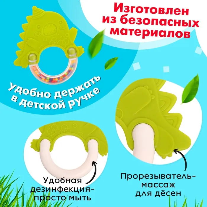 Погремушка с прорезывателем для зубов «Динозаврик» разработана специально для малышей с рождения. Игрушка привлечёт внимание милым дизайном, яркими цветами, и надолго займёт малыша.