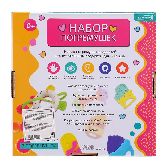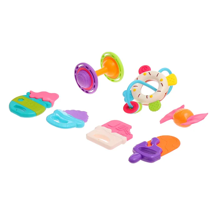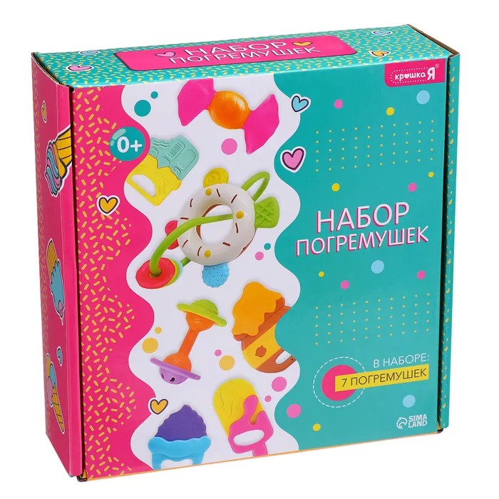 Яркий и развивающий набор из 7 погремушек в виде сладостей станет отличным спутником для малыша с первых дней жизни. Каждая погремушка выполнена из безопасных материалов и имеет приятную текстуру.