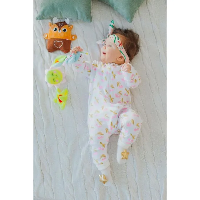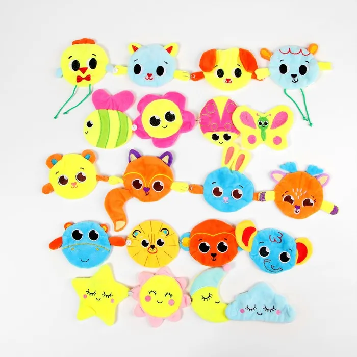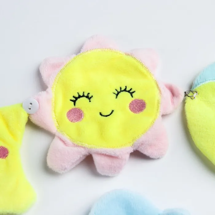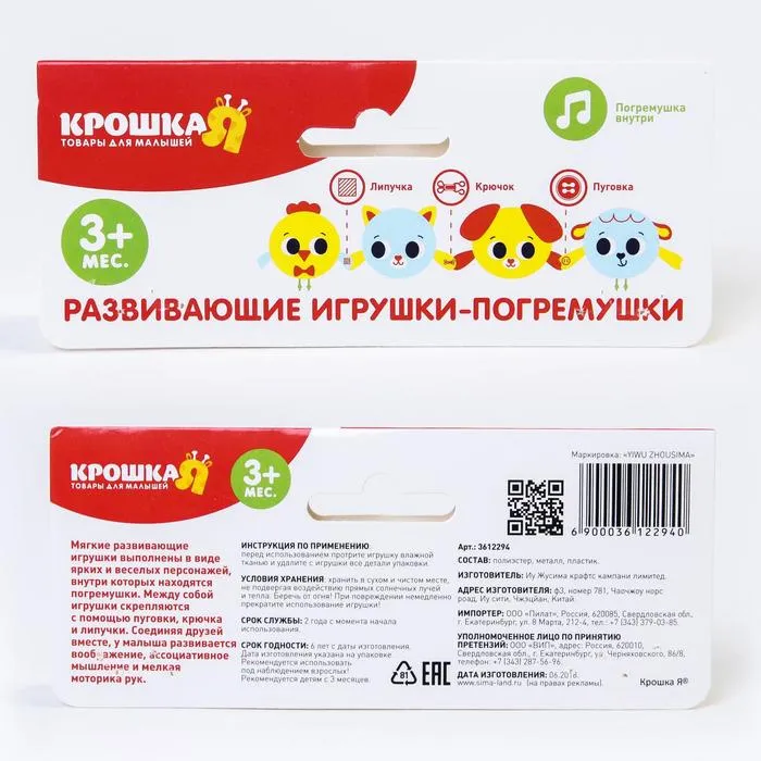 - Каждая погремушка отличается формой и цветом. В комплекте есть элементы с липучкой, пуговкой и крючком, которые помогают ребёнку освоить новые действия и улучшить координацию движений.