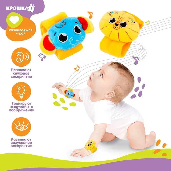 - Все предметы издают приятные звуки при встряхивании, привлекая внимание малыша. Это стимулирует слуховое восприятие и побуждает ребёнка исследовать окружающий мир через игру.