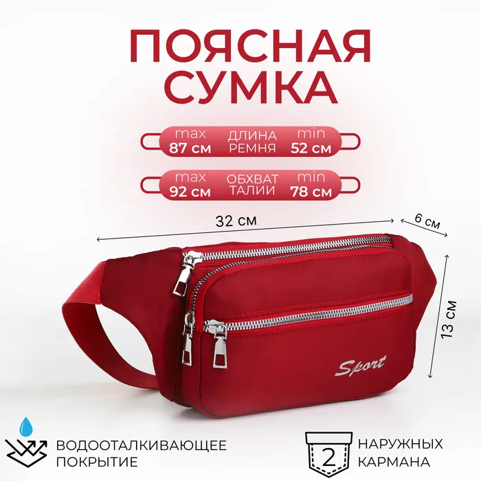 Поясная сумка на молнии, 2 наружных кармана, цвет красный — Характеристики