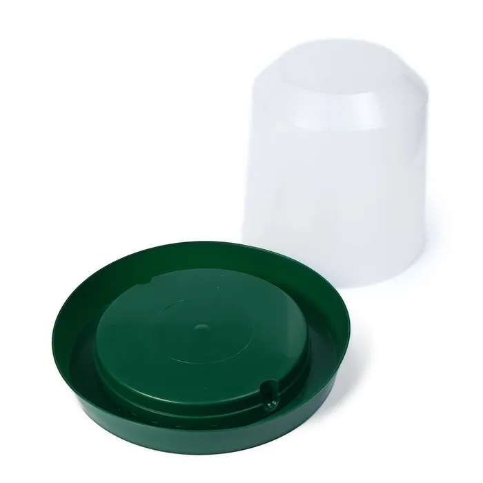 Вакуумная поилка пригодится для поения птицы. Состоит из бачка-конуса и крышки-дна.