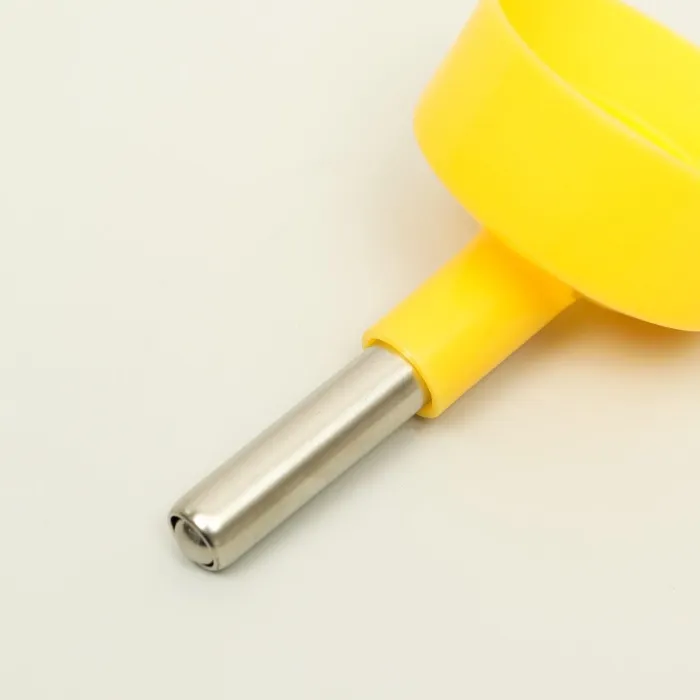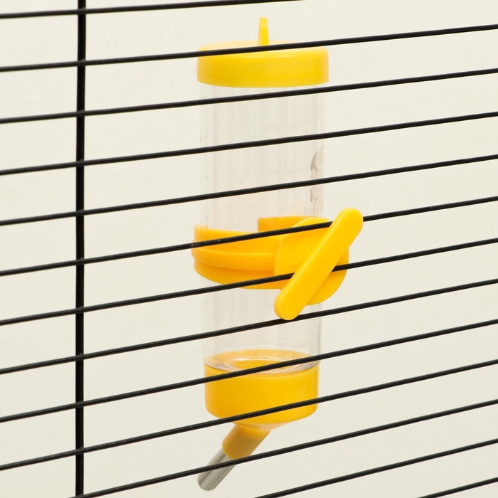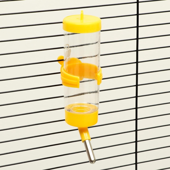 Поилка крепится между прутьев клетки, оснащена носиком из нержавеющей стали с металлическим шариком, который препятствует вытеканию воды.