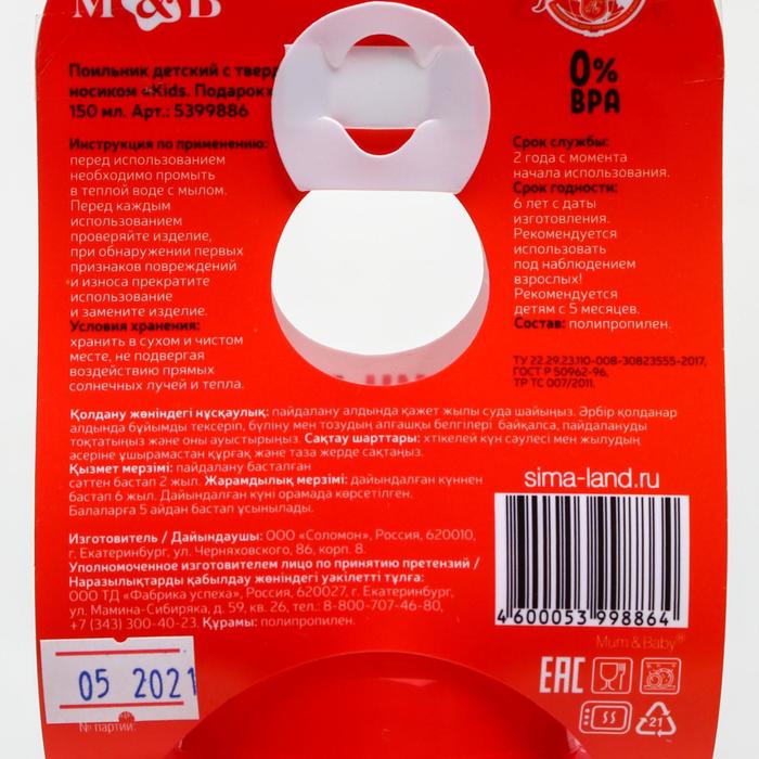Качество товара подтверждается сертификатом соответствия ЕАС. Поильник выполнен из безопасного пластика, предназначенного для производства детской посуды.