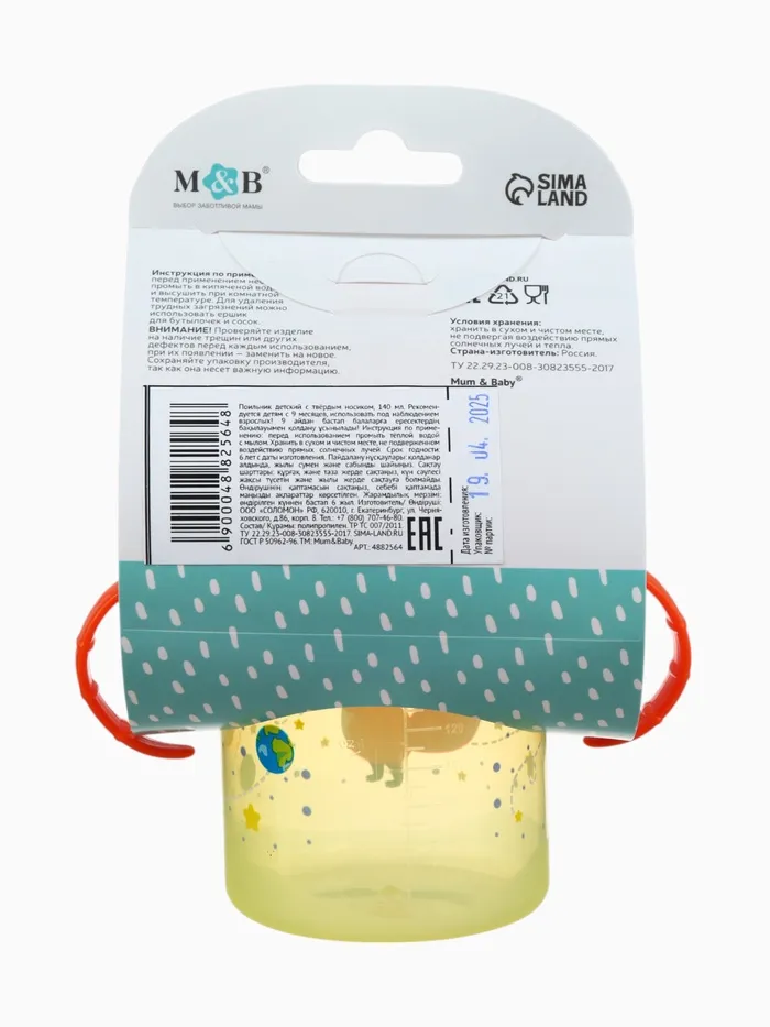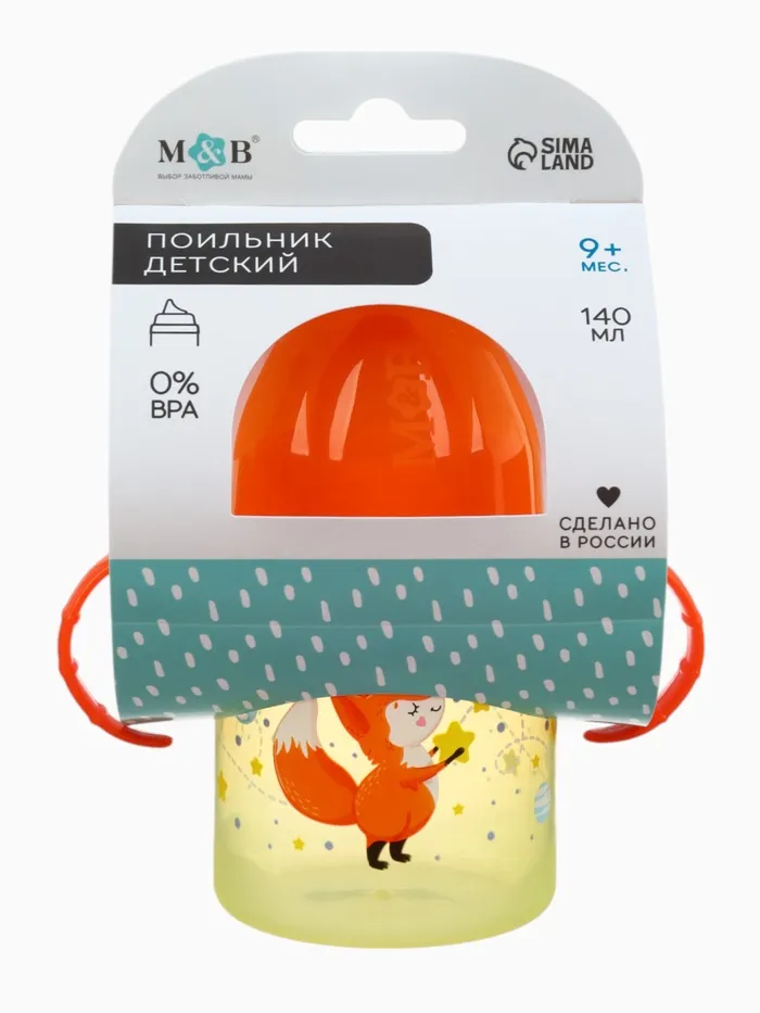 Поильник детский M&B «Лисята. Мамы и малыши» с твёрдым носиком, от 9 мес., 140 мл., с ручками, оранжевый — Характеристики