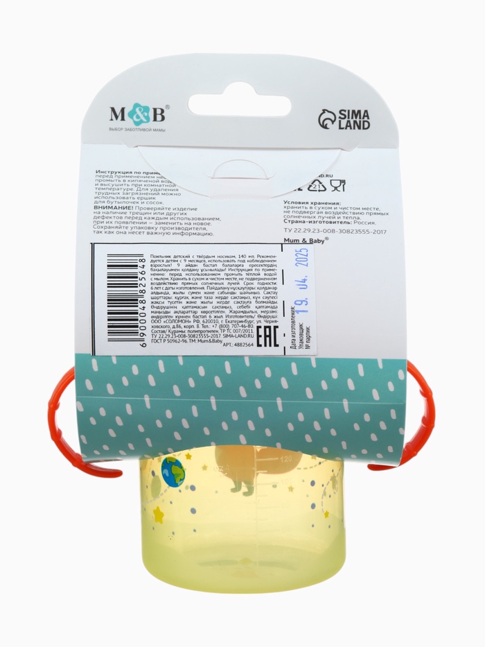 Качество товара подтверждается сертификатом соответствия ЕАС. Поильник выполнен из безопасного пластика, предназначенного для производства детской посуды.