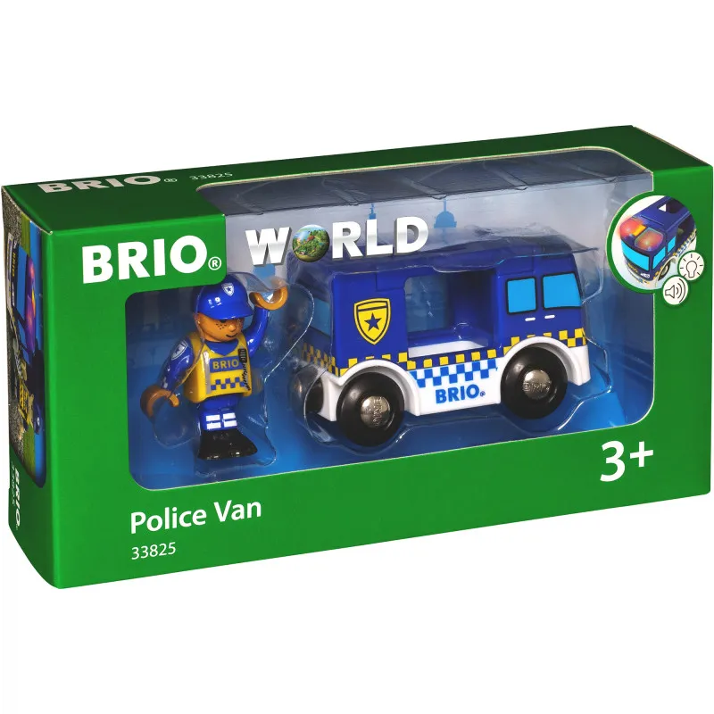 Полицейская машина Brio 33825 мчится на место событий с мигающими огнями и сиреной. Произошла авария, и полиция направляет движение по новому маршруту. Сейчас не время для преступников, но ситуации могут быстро меняться. Полицейская машина оснащена световыми и звуковыми эффектами, открывающейся крышей и местом для полицейского персонажа. Полностью совместима с миром Brio World.