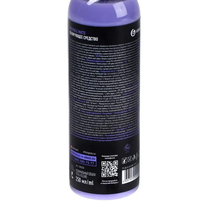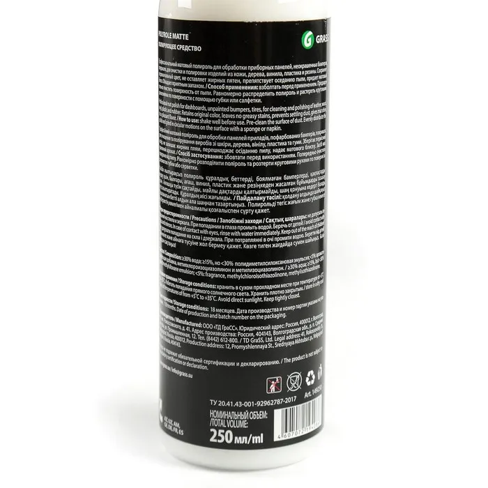 Назначение: Профессиональный матовый полироль для обработки приборных панелей, неокрашенных бамперов, покрышек, для очистки и полировки изделий из кожи, дерева винила, пластика и резины. Может применяться как очиститель-кондиционер кожи. Сохраняет первоначальную яркость поверхности, не оставляет жирных пятен, препятствует оседанию пыли, придает матовый блеск, обладает приятным ароматом.