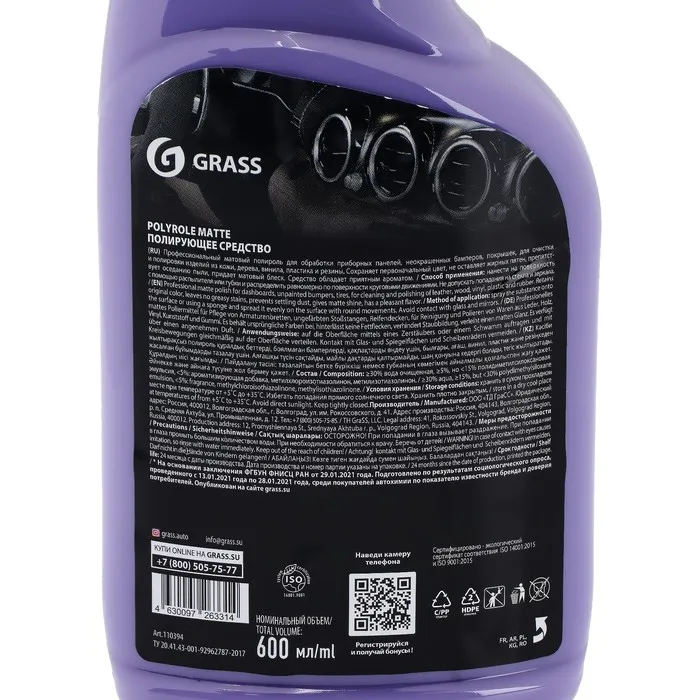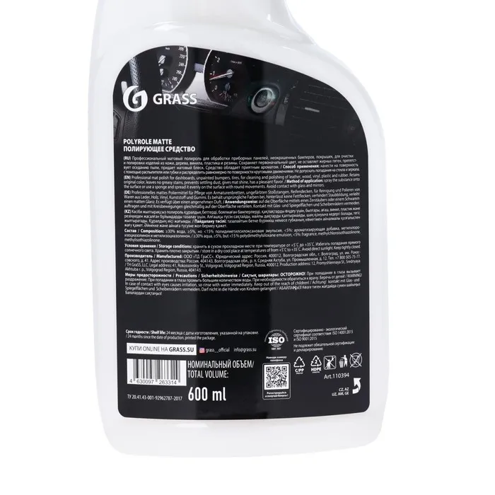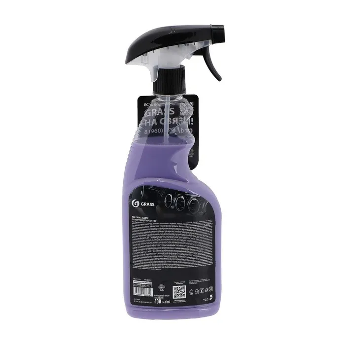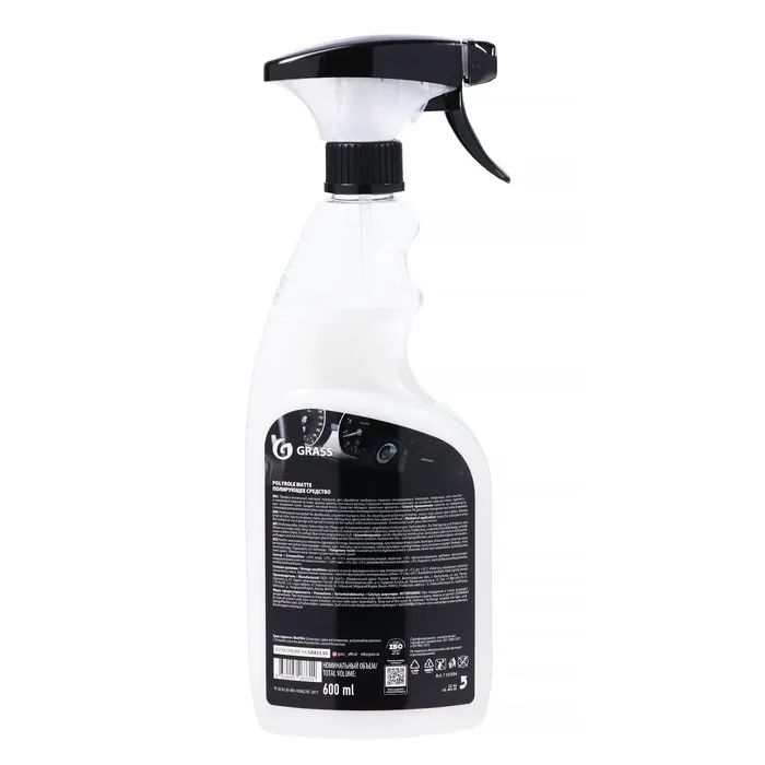 Назначение: Профессиональный матовый полироль для обработки приборных панелей, неокрашенных бамперов, покрышек, для очистки и полировки изделий из кожи, дерева винила, пластика и резины. Может применяться как очиститель-кондиционер кожи. Сохраняет первоначальную яркость поверхности, не оставляет жирных пятен, препятствует оседанию пыли, придает матовый блеск, обладает приятным ароматом.