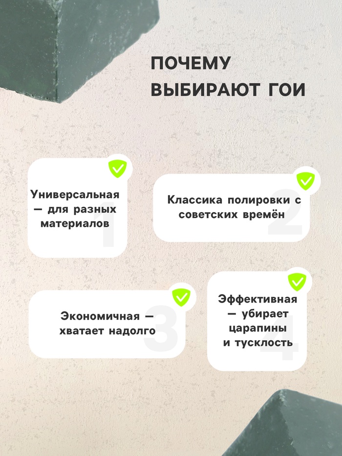 Полировальная паста ГОИ - это универсальное средство для достижения идеального блеска на металлических, стеклянных, пластиковых и других поверхностях. Благодаря своей мелкозернистой абразивной смеси, она эффективно удаляет царапины и риски, придавая поверхности зеркальный блеск. Паста ГОИ превосходно подходит для чистки и полировки клинка ножа или топора, а также пригодится автомобилистам для обновления фар или маскировки царапин на металле.